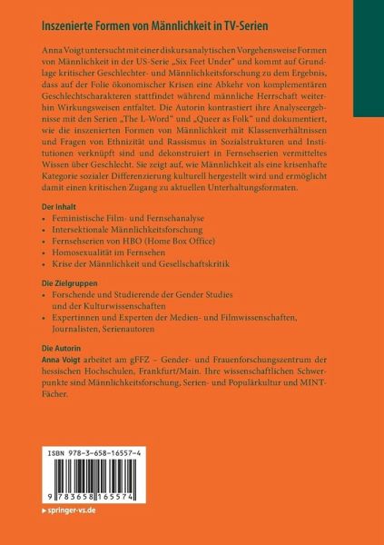 Anna Voigt untersucht mit einer diskursanalytischen Vorgehensweise Formen von Männlichkeit in der US-Serie "Six Feet Under" und kommt auf Grundlage kritischer Geschlechter- und Männlichkeitsforschung zu dem Ergebnis, dass auf der Folie ökonomischer Krisen eine Abkehr von komplementären Geschlechtscharakteren stattfindet während männliche Herrschaft weiterhin Wirkungsweisen entfaltet. Die Autorin kontrastiert ihre Analyseergebnisse mit den Serien "The L-Word" und "Queer as Folk" und dokumentiert, wie die inszenierten Formen von Männlichkeit mit Klassenverhältnissen und Fragen von Ethnizität und Rassismus in Sozialstrukturen und Institutionen verknüpft sind und dekonstruiert in Fernsehserien vermitteltes Wissen über Geschlecht. Sie zeigt auf, wie Männlichkeit als eine krisenhafte Kategorie sozialer Differenzierung kulturell hergestellt wird und ermöglicht damit einen kritischen Zugang zu aktuellen Unterhaltungsformaten.