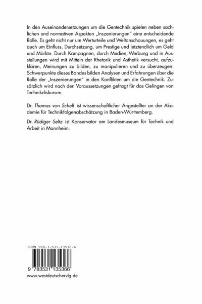 In den Auseinandersetzungen um die Gentechnik spielen neben sachlichen und normativen Aspekten "Inszenierungen" eine entscheidende Rolle. Es geht nicht nur um Werturteile und Weltanschauungen, es geht auch um Einfluss, Durchsetzung, um Prestige und letztendlich um Geld und Märkte. Durch Kampagnen, durch Medien, Werbung und in Ausstellungen wird mit Mitteln der Rhetorik und Ästhetik versucht, aufzuklären, Meinungen zu bilden, zu manipulieren und zu überzeugen. Schwerpunkte dieses Bandes bilden Analysen und Erfahrungen über die Rolle von "Inszenierungen" in den Konflikten um die Gentechnik. Zusätzlich wird nach den Voraussetzungen gefragt für das Gelingen von Technikdiskursen.