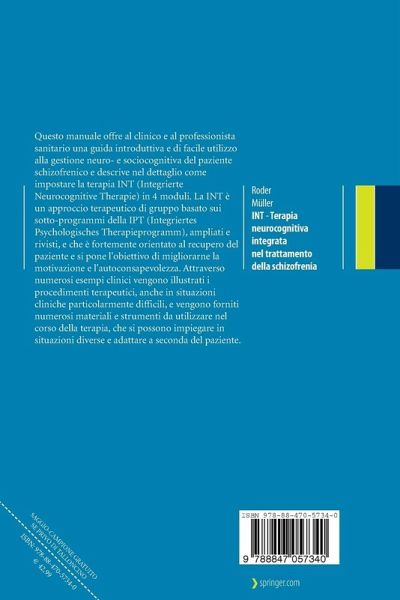 Questo manuale offre al clinico e al professionista sanitario una guida introduttiva e di facile utilizzo alla gestione neuro- e sociocognitiva del paziente schizofrenico e descrive nel dettaglio come impostare la terapia INT (Integrierte Neurocognitive Therapie) in 4 moduli. La INT è un approccio terapeutico di gruppo basato sui sotto-programmi della IPT (Integrierten Psychologischen Therapieprogamm), ampliati e rivisti, e che è fortemente orientato al recupero del paziente e si pone l'obiettivo di migliorarne la motivazione e l'autoconsapevolezza. Attraverso numerosi esempi clinici vengono illustrati i procedimenti terapeutici, anche in situazioni cliniche particolarmente difficili, e vengono forniti numerosi materiali e strumenti da utilizzare nel corso della terapia, che si possono impiegare in situazioni diverse e adattare a seconda del paziente.