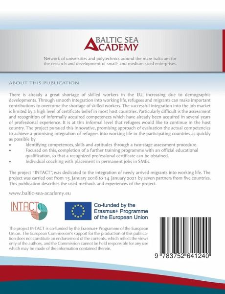 There is already a great shortage of skilled workers in the EU, increasing due to demographic developments. Through smooth integration into working life, refugees and migrants can make important contributions to overcome the shortage of skilled workers. The successful integration into the job market is limited by a high level of certificate belief in most host countries. Particularly difficult is the assessment and recognition of informally acquired competences which have already been acquired in several years of professional experience. It is at this informal level that refugees would like to continue in the host country. The project pursued this innovative, promising approach of evaluating the actual competencies to achieve a promising integration of refugees into working life in the participating countries as quickly as possible by1. Identifying competencies, skills and aptitudes through a two-stage assessment procedure.2. Focused on this, completion of a further training programme with an official educational qualification so that a recognized professional certificate can be obtained.3.Individual coaching with placement in permanent jobs in SMEs.The project INTACT, was dedicated to the integration of newly arrived migrants into working life. The project was carried out from 15. January 2018 to 14. January 2021 by seven partners from five countries. This publication describes the used methods and experiences of the project.