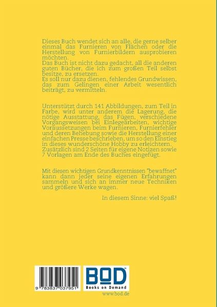 Mit diesem Buch möchte ich jedem Interessierten das Grundwissen, das zum Gelingen einer Furnierarbeit wesentlich beiträgt, zu vermitteln.Unterstützt durch 141 Abbildungen, zum Teil in Farbe, wird unter anderem die Lagerung, die nötige Ausstattung, das Fügen, verschiedene Vorgangsweisen bei Einlegearbeiten, wichtige Voraussetzungen beim Furnieren, Furnierfehler und deren Behebung sowie die Herstellung einer einfachen Presse Schritt für Schritt beschrieben, um so den Einstiegzu erleichtern.Zusätzlich sind 2 Seiten für eigene Notizen sowie 7 Vorlagen am Ende des Buches eingefügt.