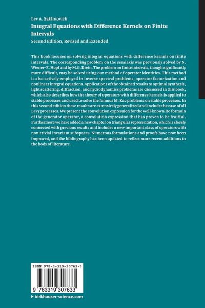 This book focuses on solving integral equations with difference kernels on finite intervals. The corresponding problem on the semiaxis was previously solved by N. Wiener-E. Hopf and by M.G. Krein. The problem on finite intervals, though significantly more difficult, may be solved using our method of operator identities. This method is also actively employed in inverse spectral problems, operator factorization and nonlinear integral equations. Applications of the obtained results to optimal synthesis, light scattering, diffraction, and hydrodynamics problems are discussed in this book, which also describes how the theory of operators with difference kernels is applied to stable processes and used to solve the famous M. Kac problems on stable processes. In this second edition these results are extensively generalized and include the case of all Levy processes. We present the convolution expression for the well-known Ito formula of the generator operator, a convolution expression that has proven to be fruitful. Furthermore we have added a new chapter on triangular representation, which is closely connected with previous results and includes a new important class of operators with non-trivial invariant subspaces. Numerous formulations and proofs have now been improved, and the bibliography has been updated to reflect more recent additions to the body of literature.