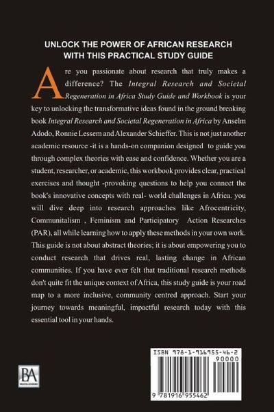 This study guide and workbook complement Integral Research and Societal Regeneration in Africa by Anselm Adodo, Ronnie Lessem, and Alexander Schieffer, providing structured support for students, researchers, and academics. It offers a systematic approach to engaging with key ideas, theories, and methodologies through interactive exercises and critical reflections.Book Layout and FormatIntroduction: Provides an overview of the book's purpose, key themes, and how to use the study guide effectively. Chapter Summaries: Each section corresponds to a chapter in Integral Research and Societal Regeneration in Africa, distilling key concepts for structured learning. Guided Reflection Questions: Encourages critical thinking and personal engagement with the material. Practical Assignments & Exercises: Helps readers apply theories to real-world research and societal challenges. Case Studies & Examples: Illustrates the methodologies in practice, reinforcing their application. Checklists & Key Takeaways: Summarises essential points to aid comprehension and retention. Research Application Toolkit: Provides step-by-step guidance on implementing integral research methodologies. Conclusion & Next Steps: Encourages readers to integrate their learning into their academic or professional research. This structured format ensures a comprehensive, interactive, and applied approach, helping readers not only understand but also implement research practices that foster societal transformation.