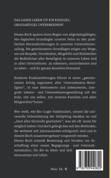 Das ganze Leben ist ein einziges, großartiges Unternehmen!Dieses Buch spannt einen Bogen von allgemeingültigen, bio-logischen Grundlagen unseres Seins zu den praktischen Herausforderungen in unserem Unternehmensalltag. Die gemeinsamen Grundlagen zeigen uns Wege, um mit Respekt, Verständnis, Mitgefühl und Wohlwollen die Bedürfnisse aller Beteiligten in unserem Leben und in allen Unternehmen zu erkennen, anzuerkennen und zu leben - und ihr ganzes kreatives Potenzial.Konkrete Praxisanleitungen führen in einen "gemeinsamen Erfolg zugunsten aller Unternehmens-Beteiligten", in eine lebenswerte und liebenswerte, integrale Lebens- und Unternehmensgestaltung mit der Erde, mit uns selbst, mit unseren Familien und allen Mitgestalter_innen.Wer weiß, wie Bio-Logie funktioniert, nimmt die universelle Unterstützung der Schöpfung dankbar an und "lässt alles Sinnvolle geschehen", was wir oft kaum für möglich halten. Und doch gelingt dies mit den Methoden, die weltweit seit Jahrtausenden erfolgreich sind und in diesem Buch zusammengefasst vorgestellt werden.Dieses Buch schenkt Besinnung und Struktur zur Erschaffung einer neuen Begegnungs- und Unternehmenskultur, für die zu leben und sich einzusetzen sich lohnt.