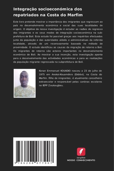 Este livro pretende mostrar a importância dos imigrantes que regressam ao país no desenvolvimento económico e social das suas localidades de origem. O objetivo da nossa investigação é estudar as razões do regresso dos imigrantes e os seus modos de integração socioeconómica na sub-prefeitura de Boli. Este estudo foi possível graças aos inquéritos efectuados junto da população e das autoridades aldeãs e administrativas da referida localidade, através de um recenseamento baseado no método de proximidade. O estudo identificou as causas da migração de retorno a Boli. Os migrantes de retorno são actores importantes no desenvolvimento económico de Boli. Ao mostrar a sua inserção, esta investigação aponta para o desenvolvimento das actividades económicas e para as realizações da população migrante regressada na subprefeitura de Boli.
