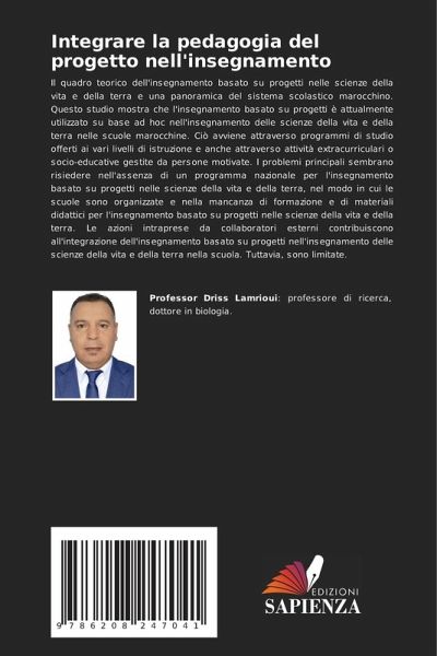 Il quadro teorico dell'insegnamento basato su progetti nelle scienze della vita e della terra e una panoramica del sistema scolastico marocchino. Questo studio mostra che l'insegnamento basato su progetti è attualmente utilizzato su base ad hoc nell'insegnamento delle scienze della vita e della terra nelle scuole marocchine. Ciò avviene attraverso programmi di studio offerti ai vari livelli di istruzione e anche attraverso attività extracurriculari o socio-educative gestite da persone motivate. I problemi principali sembrano risiedere nell'assenza di un programma nazionale per l'insegnamento basato su progetti nelle scienze della vita e della terra, nel modo in cui le scuole sono organizzate e nella mancanza di formazione e di materiali didattici per l'insegnamento basato su progetti nelle scienze della vita e della terra. Le azioni intraprese da collaboratori esterni contribuiscono all'integrazione dell'insegnamento basato su progetti nell'insegnamento delle scienze della vita e della terra nella scuola. Tuttavia, sono limitate.