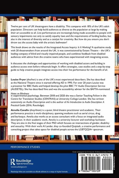 This book draws on the results of the Integrated Access Inquiry: Is It Working? A qualitative study with 20 theatremakers from around the UK, it was commissioned by Extant Theatre - the UK's leading company of blind and visually impaired people, and combines feedback from disabled audiences with advice from the creative teams who have experimented with integrating access.