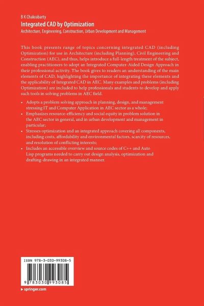This book presents range of topics concerning integrated CAD (including Optimization) for use in Architecture (including Planning), Civil Engineering and Construction (AEC), and thus, helps introduce a full-length treatment of the subject, enabling practitioners to adopt an Integrated Computer-Aided Design Approach in their professional activity. The book gives to readers an understanding of the main elements of CAD, highlighting the importance of integrating these elements and the applicability of Integrated CAD in AEC. Many examples and problems (including Optimization) are included to help professionals and students to develop and apply such tools in solving problems in AEC field. Adopts a problem solving approach in planning, design, and management stressing IT and Computer Application in AEC sector as a whole;Emphasizes resource-efficiency and social equity in problem solution in the AEC sector in general, and in urban development and management in particular;Stresses optimization and an integrated approach covering all components, including costs, affordability and environmental factors, scarcity of resources, and resolution of conflicting interests;Includes an accessible overview and source codes of C++ and Auto Lisp programs needed to carry out design analysis, optimization and drafting-drawing in an integrated manner.