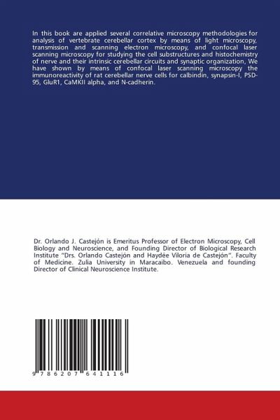 In this book are applied several correlative microscopy methodologies for analysis of vertebrate cerebellar cortex by means of light microscopy, transmission and scanning electron microscopy, and confocal laser scanning microscopy for studying the cell substructures and histochemistry of nerve and their intrinsic cerebellar circuits and synaptic organization, We have shown by means of confocal laser scanning microscopy the immunoreactivity of rat cerebellar nerve cells for calbindin, synapsin-I, PSD-95, GluR1, CaMKII alpha, and N-cadherin.