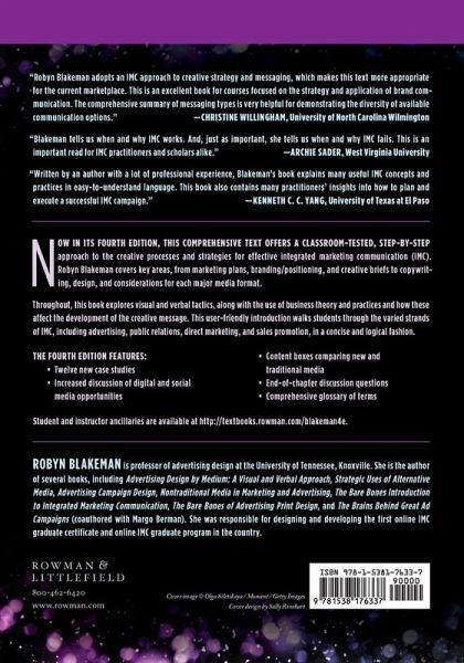 Now in its fourth edition, this comprehensive text offers a classroom-tested, step-by-step approach to the creative processes and strategies for effective integrated marketing communication (IMC). Robyn Blakeman covers key areas, from marketing plans, branding/positioning, and creative briefs to copywriting, design, and considerations for each major media format. Throughout, the book explores visual and verbal tactics, along with the use of business theory and practices and how these affect the development of the creative message. This user-friendly introduction walks students through the varied strands of IMC, including advertising, PR, direct marketing, and sales promotion, in a concise and logical fashion. The fourth edition features ¿Twelve new case studies ¿Increased discussion of digital and social media opportunities ¿Content boxes comparing new and traditional media ¿End of chapter discussion questions ¿Comprehensive glossary of terms Student and instructor ancillaries available at http://textbooks.rowman.com/blakeman4e.
