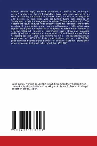 Wheat (Triticum Spp.) has been described as "Staff of life or king of cereals" and one of the most important staple food crop. Wheat has its own outstanding importance as a human food; it is rich in carbohydrates and protein. A case study was conducted during rabi seasons on "Integrated nutrient management in wheat (Triticum aestivum L.)". The experiment results showed that effective tillers/mrl, ear head length (cm), number of grains/spike, grain, straw and biological yields (q/ha) were significantly higher in canal water as compared to saline water. Number of effective tillers/mrl, number of grains/spike, grain, straw and biological yields (q/ha) were maximum in Azotobacter ST3 and Pseudomonas P36 + vermicompost @5 t/ha and minimum in no inoculation treatment. Application of 125% RDF, being statistically at par with 100% RDF, produced significantly higher number of effective tillers/mrl, grains/spike, grain, straw and biological yields (q/ha) than 75% RDF.