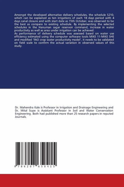 Amongst the developed alternative delivery schedules, the schedule S210, which can be explained as ten irrigations of each 18 days period with 4 days canal closure and with start date as 15th October, was observed to be the best as compare to existing schedule. By implementing the selected schedules in the Hanuman sagar reservoir command, increase in water productivity as well as area under irrigation can be achieved.As performance of delivery schedule was assessed based on water use efficiency estimated using the computer software tools MIKE 11-MIKE SHE and modified 'FAO crop water productivity model', it needs to be validated on field scale to confirm the actual variation in observed values of this study.