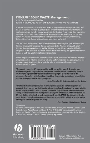 This 2nd edition also provides a more user-friendly model (IWM-2) for waste managers. To make it more widely accessible, this edition provides the new tool in Windows format, with greatly improved input and output features, and the ability to compare different scenarios. A detailed user s guide is provided, to take the reader through the use of the IWM-2 model, step by step. IWM-2 is designed to be an "entry level" LCI model for solid waste - user-friendly and appropriate to users starting to apply life cycle thinking to waste systems - while more expert users will also find many of the advanced features of the IWM-2 model helpful. IWM-2 is delivered on CD inside the book.