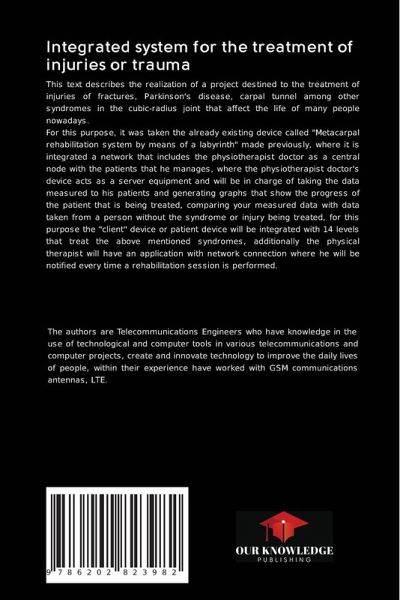 This text describes the realization of a project destined to the treatment of injuries of fractures, Parkinson's disease, carpal tunnel among other syndromes in the cubic-radius joint that affect the life of many people nowadays.For this purpose, it was taken the already existing device called "Metacarpal rehabilitation system by means of a labyrinth" made previously, where it is integrated a network that includes the physiotherapist doctor as a central node with the patients that he manages, where the physiotherapist doctor's device acts as a server equipment and will be in charge of taking the data measured to his patients and generating graphs that show the progress of the patient that is being treated, comparing your measured data with data taken from a person without the syndrome or injury being treated, for this purpose the "client" device or patient device will be integrated with 14 levels that treat the above mentioned syndromes, additionally the physical therapist will have an application with network connection where he will be notified every time a rehabilitation session is performed.