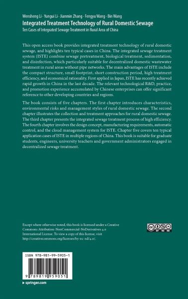 This open access book provides integrated treatment technology of rural domestic sewage, and highlights ten typical cases in China. The integrated sewage treatment system (ISTE) combine sewage pretreatment, biological treatment, sedimentation, and disinfection, which particularly suitable for decentralized domestic wastewater treatment in rural areas without pipe networks. The main advantages of ISTE include the compact structure, small footprint, short construction period, high treatment efficiency, and economical rationality. First applied in Japan, ISTE has recently achieved rapid growth in China in the last decade. The relevant technological R&D, practice, and promotion experience accumulated by Chinese enterprises can offer significant reference to other developing countries and regions. The book consists of five chapters. The first chapter introduces characteristics, environmental risks and management styles of rural domestic sewage. The second chapter illustrates the collection and treatment approaches for rural domestic sewage.The third chapter presents the integrated sewage treatment process of high efficiency. The fourth chapter involves the design concept, manufacturing requirements, automatic control, and the cloud management system for ISTE. Chapter five covers ten typical application cases of ISTE in multiple regions of China. This book is suitable for graduate students, engineers, university teachers and government administrators engaged in decentralized sewage treatment.