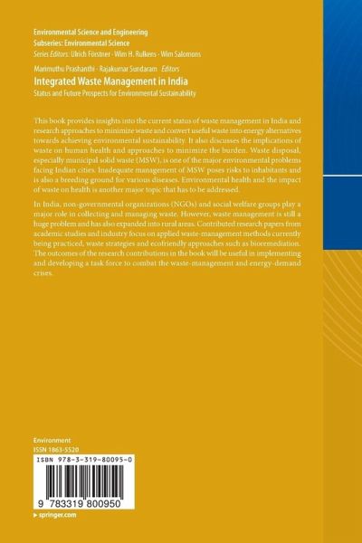 This book provides insights into the current status of waste management in India and research approaches to minimize waste and convert useful waste into energy alternatives towards achieving environmental sustainability. It also discusses the implications of waste on human health and approaches to minimize the burden. Waste disposal, especially municipal solid waste (MSW), is one of the major environmental problems facing Indian cities. Inadequate management of MSW poses risks to inhabitants and is also a breeding ground for various diseases. Environmental health and the impact of waste on health is another major topic that has to be addressed.