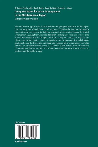 Preface.- Foreword.- PART I. IWRM IN THE MEDITERRANEAN REGION.- Transboundary IWRM Attempts in the Mediterranean Emphasis on the Drin River Case and the Involvement of Stakeholders.- Integrated water management in Tunisia: Meeting the climate change challenges.- Improving Agricultural Water Productivity: A viable response to water scarcity in the dry areas.- Conceptual Frame on Technological Perspective for Water Resources Management in the Mediterranean Region.- PART II. WATER RESOURCES MANAGEMENT UNDER CLIMATE AND LAND USE CHANGES IN THE MEDITERRANEAN REGION.- Water Resources Management under Possible Future Climate and Land Use Changes. The application of the Integrated Hydrological Modelling System, IHMS.- Challenges and Issues on Measuring, Modelling and Managing the Water Resources under Changing Climate and Land Use.- Water Valuation in Agriculture in the Souss-Massa Basin (Morocco).- PART III. NON CONVENTIONAL WATER MANAGEMENTS AND POLLUTION CONTROL.- Perspectives of Wastewater Reuse in the Mediterranean Region.- Wastewater Production, Treatment and Reuse around the Mediterranean Region: Current Status and Main Drivers.- Pollution and Measures towards De-Pollution of the Mediterranean Sea.- Recycling and reuse of treated waste water: challenges and perspectives. The example of the Júcar River Basin District and the Albufera Lake.- PART IV. WATER POLICIES, GOVERNANCE AND SOCIAL ISSUES.- Mediterranean Water Outlook: Perspective on Policies & Water Management in Arab Countries.- Identifying risks, actions and opportunities for a water long term strategy in the Mediterranean.- Mediterranean Water Policies Conceptual frame.- Effective water governance and how to achieve.- Water and Food Security in the Arab Region.- Analysis of Gender Roles Related to Water Resources Management in the Case of App Fruit Tree Planting Project in the Béni Mellal Area.- Integrated Participatory Water Resources Management and Water Governance.- Violence, the BititCanal and the Nile Basin: An Asymmetric Comparison.- General Conclusions.- Acknowledgements.- List of Abbreviations.