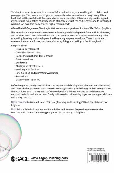 This interdisciplinary core textbook looks at learning and development from birth to 19 years providing, an accessible introduction to the common areas of study across the many roles supporting learning and development in the young people's workforce. There is coverage of common themes and issues, and theory is closely integrated with practice throughout. Chapters cover: - physical development - cognitive development - social and emotional development - professionalism - leadership - quality and effectiveness - working with families - safeguarding and promoting well-being - transitions - equality and inclusion Reflection points, workplace activities and professional development planners are all included and these challenge readers and students to critically engage with theory in their own practice. The book focuses on the key areas of knowledge that all those working with children are required to study, and places them firmly in the context of working together to support children and young people. Nadia Edmond is Assistant Head of School (Teaching and Learning/CPD), at the University of Brighton. Mark Price is Principal Lecturer and Foundation and Honours Degree Programme Leader Working with Children and Young People at the University of Brighton.