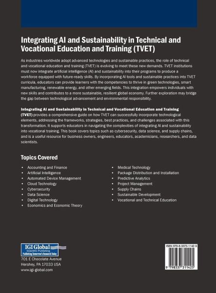 "To provide a structured framework for integrating AI and sustainability in TVET curricula and practices. To document best practices and successful case studies of AI and sustainability integration in TVET"-- Provided by publisher.
