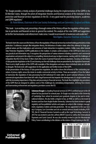 The book charts the course and the history of how the regulation of financial services has evolved looking particularly at data protection. It addresses concepts like integration theory, the behaviour of nation-states when they attempt to forge geo-political unions and the implications and outcomes of state interaction in regulatory matters. Unlike many other General Data Protection Regulation (GDPR) publications in the market, it contains useful analyses of the GDPR but it does so in a very practical and informative way. It recognises the perspectives of various interests including academics and commercial organisations and presents the subject in a compelling, historical and easy to digest manner, starting with the challenges of integration that the EU has faced. It then charts the course of general financial services regulation, focusing on the history of data protection legislation in the EU and drawing out the real challenges that are presented by the legislative framework. There is an in-depth analysis of the GDPR with examples of the derogations and areas where individual states are still able to derogate. The book ends with suggestions for the application and further review of the GDPR. In the presentation of the history of data protection regulation, the author shows the influence of the contrasting narratives of privacy rights versus the desire to enable commercial activity to thrive. There are examples of how the failure to harmonise the regulation of data processing has left individual EU states able to assert national influence so that commercial organisations have been left with a legal framework that impedes the development of a single market even with the increasing importance of big data and processing in financial services. The book then highlights key provisions of the GDPR that are designed to address some of the challenges by centralising interpretation, defining flow-downs and harmonising enforcement and regulatory provisions across the EU.