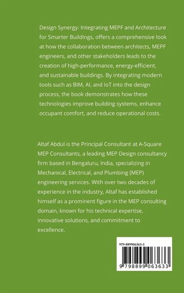 "Design Synergy: Integrating MEPF and Architectural design for Smarter Buildings" offers a comprehensive look at how the collaboration between architects, MEPF engineers, and other stakeholders leads to the creation of high-performance, energy-efficient, and sustainable buildings. By integrating modern tools such as BIM, AI, and IoT into the design process, the book demonstrates how these technologies improve building systems, enhance occupant comfort, and reduce operational costs. With real-world case studies, practical tips for project management, and a thorough exploration of the role of sustainability and green building certifications, the book serves as an essential guide for professionals seeking to understand and implement integrated design in the modern construction industry. As the industry continues to evolve, the integration of architecture and MEPF systems will play a pivotal role in shaping the future of smarter, more sustainable buildings.