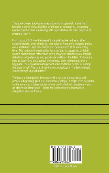 This book covers Lebesgue integration and its generalizations from Daniell's point of view, modified by the use of seminorms. Integrating functions rather than measuring sets is posited as the main purpose of measure theory.