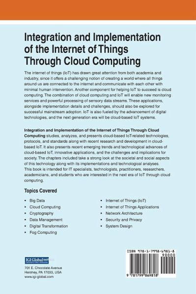 The internet of things (IoT) has drawn great attention from both academia and industry, since it offers a challenging notion of creating a world where all things around us are connected to the internet and communicate with each other with minimal human intervention. Another component for helping IoT to succeed is cloud computing. The combination of cloud computing and IoT will enable new monitoring services and powerful processing of sensory data streams. These applications, alongside implementation details and challenges, should also be explored for successful mainstream adoption. IoT is also fueled by the advancement of digital technologies, and the next generation era will be cloud-based IoT systems. Integration and Implementation of the Internet of Things Through Cloud Computing studies, analyzes, and presents cloud-based IoT-related technologies, protocols, and standards along with recent research and development in cloud-based IoT. It also presents recent emerging trends and technological advances of cloud-based IoT, innovative applications, and the challenges and implications for society. The chapters included take a strong look at the societal and social aspects of this technology along with its implementations and technological analyses. This book is intended for IT specialists, technologists, practitioners, researchers, academicians, and students who are interested in the next era of IoT through cloud computing.