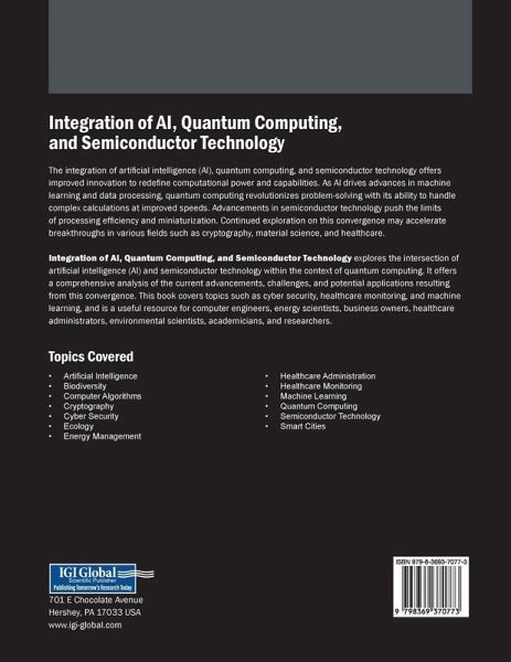 The integration of artificial intelligence (AI), quantum computing, and semiconductor technology offers improved innovation to redefine computational power and capabilities. As AI drives advances in machine learning and data processing, quantum computing revolutionizes problem-solving with its ability to handle complex calculations at improved speeds. Advancements in semiconductor technology push the limits of processing efficiency and miniaturization. Continued exploration on this convergence may accelerate breakthroughs in various fields such as cryptography, material science, and healthcare. Integration of AI, Quantum Computing, and Semiconductor Technology explores the intersection of artificial intelligence (AI) and semiconductor technology within the context of quantum computing. It offers a comprehensive analysis of the current advancements, challenges, and potential applications resulting from this convergence. This book covers topics such as cyber security, healthcare monitoring, and machine learning, and is a useful resource for computer engineers, energy scientists, business owners, healthcare administrators, environmental scientists, academicians, and researchers.