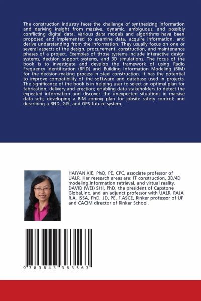 The construction industry faces the challenge of synthesizing information and deriving insight from massive, dynamic, ambiguous, and possibly conflicting digital data. Various data models and algorithms have been proposed and implemented to examine data, acquire information, and derive understanding from the information. They usually focus on one or several aspects of the design, procurement, construction, and maintenance phases of a project. Examples of those systems include interactive design systems, decision support systems, and 3D simulations. The focus of the book is to investigate and develop the framework of using Radio Frequency Identification (RFID) and Building Information Modeling (BIM) for the decision-making process in steel construction. It has the potential to improve compatibility of the software and database used in projects. The significance of the book is in helping user to select an optimal plan for fabrication, delivery and erection; enabling data stakeholders to detect the expected information and discover the unexpected situations in massive data sets; developing a BIM zoning plan for jobsite safety control; and describing a RFID, GIS, and GPS future system.
