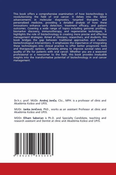 This book offers a comprehensive examination of how biotechnology is revolutionizing the field of oral cancer. It delves into the latest advancements in molecular diagnostics, targeted therapies, and personalized medicine, providing a detailed analysis of how these innovations enhance early detection, treatment efficacy, and patient outcomes. Covering a wide range of topics including genomic profiling, biomarker discovery, immunotherapy, and regenerative techniques, it highlights the role of biotechnology in creating more precise and effective management strategies. Aimed at clinicians, researchers, and students, this book bridges the gap between traditional approaches and modern biotechnological interventions. It emphasizes the importance of integrating these technologies into clinical practice to offer better prognostic tools and therapeutic options, ultimately aiming to improve survival rates and quality of life for patients with oral cancer. Whether you are a seasoned professional or a newcomer to the field, this book provides invaluable insights into the transformative potential of biotechnology in oral cancer management.