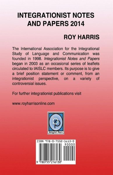 The International Association for the Integrational Study of Language and Communication was founded in 1998. Integrationist Notes and Papers began in 2003 as an occasional series of leaflets circulated to IAISLC members. Its purpose is to give a brief position statement or comment, from an integrationist perspective, on a variety of controversial issues. For further integrationist publications visit www.royharrisonline.com