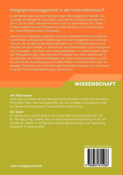 Gernot Dern entwickelt ausgehend von einem systemtheoretisch fundierten Grundmodell umfassende Empfehlungen für das Management der Unternehmens-IT, die auf Basis eines Referenzmodells zur IT-Prozesslandschaft miteinander verzahnt werden. Er entwirft ein Kennzahlensystem und verknüpft es mit IT-Strategie-, -Portfolio- und -Lifecycle-Modellen. In seine Empfehlungen zum Management der Unternehmens-IT integriert der Autor Aspekte der IT-Komplexität, der IT-Reaktionsfähigkeit, der Unternehmensarchitektur sowie der pro-aktiven Ausrichtung von IT-Landschaften. Im Rahmen einer breit angelegten Fallstudie eines internationalen Finanzdienstleisters wird die Anwendung der Gestaltungsempfehlungen demonstriert.