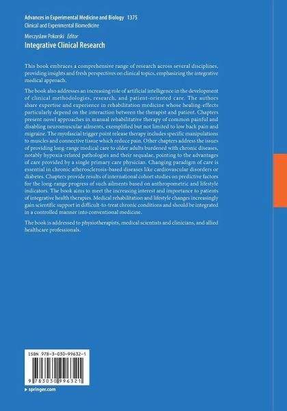 The book also addresses an increasing role of artificial intelligence in the development of clinical methodologies, research, and patient-oriented care. The authors share expertise and experience in rehabilitation medicine whose healing-effects particularly depend on the interaction between the therapist and patient. Chapters present novel approaches in manual rehabilitative therapy of common painful and disabling neuromuscular ailments, exemplified but not limited to low back pain and migraine. The myofascial trigger point release therapy includes specific manipulations to muscles and connective tissue which reduce pain. Other chapters address the issues of providing long-range medical care to older adults burdened with chronic diseases, notably hypoxia-related pathologies and theirsequalae, pointing to the advantages of care provided by a single primary care physician. Changing paradigm of care is essential in chronic atherosclerosis-based diseases like cardiovascular disorders or diabetes. Chapters provide results of international cohort studies on predictive factors for the long-range progress of such ailments based on anthropometric and lifestyle indicators. The book aims to meet the increasing interest and importance to patients of integrative health therapies. Medical rehabilitation and lifestyle changes increasingly gain scientific support in difficult-to-treat chronic conditions and should be integrated in a controlled manner into conventional medicine.