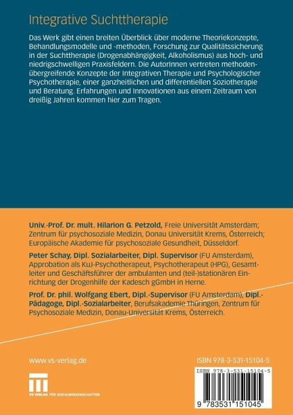 Das Werk gibt einen breiten Überblick über moderne Theoriekonzepte, Behandlungsmodelle und -methoden, Forschung zur Qualitätssicherung in der Suchttherapie (Drogenabhängigkeit, Alkoholismus) aus hoch- und niedrigschwelligen Praxisfeldern. Die AutorInnen vertreten methodenübergreifende Konzepte der Integrativen Therapie und Psychologischer Psychotherapie, einer ganzheitlichen und differentiellen Soziotherapie und Beratung. Erfahrungen und Innovationen aus einem Zeitraum von dreißig Jahren kommen hier zum Tragen.