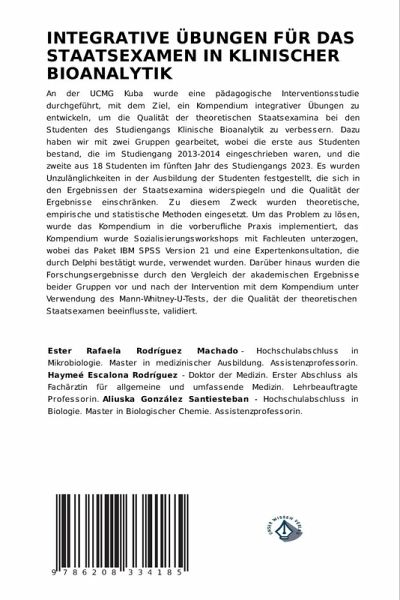 An der UCMG Kuba wurde eine pädagogische Interventionsstudie durchgeführt, mit dem Ziel, ein Kompendium integrativer Übungen zu entwickeln, um die Qualität der theoretischen Staatsexamina bei den Studenten des Studiengangs Klinische Bioanalytik zu verbessern. Dazu haben wir mit zwei Gruppen gearbeitet, wobei die erste aus Studenten bestand, die im Studiengang 2013-2014 eingeschrieben waren, und die zweite aus 18 Studenten im fünften Jahr des Studiengangs 2023. Es wurden Unzulänglichkeiten in der Ausbildung der Studenten festgestellt, die sich in den Ergebnissen der Staatsexamina widerspiegeln und die Qualität der Ergebnisse einschränken. Zu diesem Zweck wurden theoretische, empirische und statistische Methoden eingesetzt. Um das Problem zu lösen, wurde das Kompendium in die vorberufliche Praxis implementiert, das Kompendium wurde Sozialisierungsworkshops mit Fachleuten unterzogen, wobei das Paket IBM SPSS Version 21 und eine Expertenkonsultation, die durch Delphi bestätigt wurde,verwendet wurden. Darüber hinaus wurden die Forschungsergebnisse durch den Vergleich der akademischen Ergebnisse beider Gruppen vor und nach der Intervention mit dem Kompendium unter Verwendung des Mann-Whitney-U-Tests, der die Qualität der theoretischen Staatsexamen beeinflusste, validiert.
