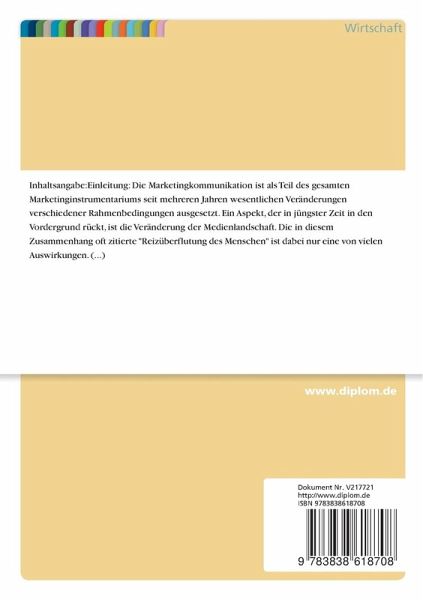Die Marketingkommunikation ist als Teil des gesamten Marketinginstrumentariums seit mehreren Jahren wesentlichen Veränderungen verschiedener Rahmenbedingungen ausgesetzt. Ein Aspekt, der in jüngster Zeit in den Vordergrund rückt, ist die Veränderung der Medienlandschaft. Die in diesem Zusammenhang oft zitierte "Reizüberflutung des Menschen" ist dabei nur eine von vielen Auswirkungen.
