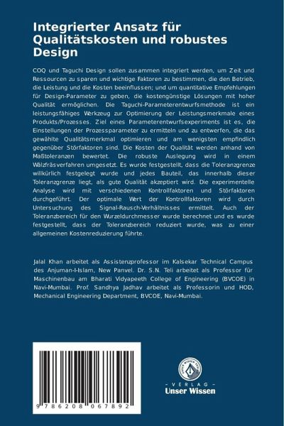 COQ und Taguchi Design sollen zusammen integriert werden, um Zeit und Ressourcen zu sparen und wichtige Faktoren zu bestimmen, die den Betrieb, die Leistung und die Kosten beeinflussen; und um quantitative Empfehlungen für Design-Parameter zu geben, die kostengünstige Lösungen mit hoher Qualität ermöglichen. Die Taguchi-Parameterentwurfsmethode ist ein leistungsfähiges Werkzeug zur Optimierung der Leistungsmerkmale eines Produkts/Prozesses. Ziel eines Parameterentwurfsexperiments ist es, die Einstellungen der Prozessparameter zu ermitteln und zu entwerfen, die das gewählte Qualitätsmerkmal optimieren und am wenigsten empfindlich gegenüber Störfaktoren sind. Die Kosten der Qualität werden anhand von Maßtoleranzen bewertet. Die robuste Auslegung wird in einem Wälzfräsverfahren umgesetzt. Es wurde festgestellt, dass die Toleranzgrenze willkürlich festgelegt wurde und jedes Bauteil, das innerhalb dieser Toleranzgrenze liegt, als gute Qualität akzeptiert wird. Die experimentelle Analyse wird mit verschiedenen Kontrollfaktoren und Störfaktoren durchgeführt. Der optimale Wert der Kontrollfaktoren wird durch Untersuchung des Signal-Rausch-Verhältnisses ermittelt. Auch der Toleranzbereich für den Wurzeldurchmesser wurde berechnet und es wurde festgestellt, dass der Toleranzbereich reduziert wurde, was zu einer allgemeinen Kostenreduzierung führte.