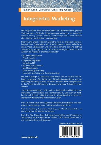 Seit einigen Jahren erlebt das Marktumfeld von Unternehmen tief greifende Veränderungen. Erhebliche Zielgruppenverschiebungen auf nationalen Märkten sowie politische Umbrüche in Osteuropa und Fernost erfordern eine ständige Neudefinition des Marketing.Busch/Fuchs/Unger verstehen Marketing nicht als alleiniges Führungskonzept einer Organisation oder Unternehmung, sondern vielmehr als einen Ansatz vollständigen und vernetzten Denkens, der eine optimale Zielerreichung ermöglichen soll. Vor diesem Hintergrund setzen sich die Autoren mit allen wichtigen Facetten des Marketing auseinander. Die vierte Auflage ist vollständig überarbeitet und entspricht aktuellen Entwicklungen. Die Kapitel zum Dienstleistungsmarketing und zur Marketing-Forschung wurden wesentlich erweitert. Neu hinzugekommen ist das Thema Social Marketing. Konsequent wurden Fallstudien eingearbeitet.