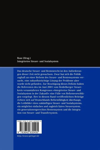Das deutsche Steuer- und Rentenrecht ist den Anforderungen dieser Zeit nicht gewachsen. Zwar hat sich die Politik zaghaft an einer Reform des Steuer- und Rentensystems versucht, eine zukunftsträchtige Lösung der Probleme aber wurde nicht gefunden. Zur Beseitigung dieses Defizits haben die Referenten des im Juni 2001 vom Heidelberger Steuerkreis veranstalteten Kongresses "Integriertes Steuer- und Sozialsystem in der Zukunft" eine Fülle von Reformvorschlägen vorgelegt. Ihre in diesem Band veröffentlichten Beiträge richten sich auf Deutschlands Reformfähigkeit überhaupt, die Leitbilder eines zukünftigen Steuer- und Sozialsystems, ein möglichst einfaches und zugleich faires Steuersystem, ein generationengerechtes Rentensystem und die Integration von Steuer- und Transfersystem.