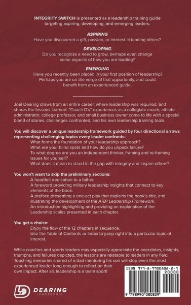 Integrity Switch is presented as a leadership training guide targeting aspiring, developing, and emerging leaders. Aspiring: Have you discovered a gift, passion, or interest in leading others? Developing: Do you recognize a need to grow, perhaps even change some aspects of how you are leading? Emerging: Have you been placed in a position of leadership with little or no formal training? Perhaps you are on the verge of that opportunity yet feel unprepared. Joel Dearing draws from an entire career, where leadership was required, and shares the lessons learned. "Coach D's" experiences as a collegiate coach, athletic administrator, college professor, and small business owner come to life with a special blend of stories, challenges confronted, and his own leadership training tools. You will discover a unique leadership framework guided by four directional arrows representing challenging topics every leader confronts: What forms the foundation of your leadership approach? What are your blind spots and how do you unpack failure? To what degree are you an independent thinker, framing and re-framing issues for yourself? What does it mean to stand in the gap with integrity and inspire others? You won't want to skip the upfront material: A dedication to a father. A foreword providing military leadership insights, previewing key elements of the book. A preface presenting a one-act play called "The Integrity Switch," which is the origin of the book's title. An introduction illustrating the development of both the A2B2 Leadership Framework and the leadership scales presented in each chapter. Even the most experienced leader will need at least one pause to stop-and-think, and turn down a corner of one page, if only from one of the handful of touching memories shared about a dad mentoring his son. Integrity Switch was intentionally written for readers who may prefer to browse the Table of Contents and start with any section or series of chapters. While coaches and sports leaders will appreciate the anecdotes, insights, and real triumphs and failures depicted, the lessons are relatable to leaders in any field.
