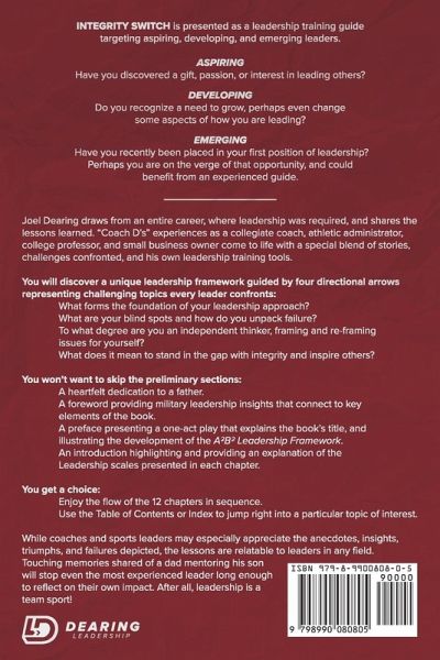 Integrity Switch is presented as a leadership training guide targeting aspiring, developing, and emerging leaders. Aspiring. Have you discovered a gift, passion, or interest in leading others? Developing. Do you recognize a need to grow, perhaps even change some aspects of how you are leading? Emerging. Have you been placed in a position of leadership with little or no formal training? Perhaps you are on the verge of that opportunity yet feel unprepared. Joel Dearing draws from an entire career, where leadership was required, and shares the lessons learned. "Coach D's" experiences as a collegiate coach, athletic administrator, college professor, and small business owner come to life with a special blend of stories, challenges confronted, and his own leadership training tools. You will discover a unique leadership framework guided by four directional arrows representing challenging topics every leader confronts: What forms the foundation of your leadership approach? What are your blind spots and how do you unpack failure? To what degree are you an independent thinker, framing and re-framing issues for yourself? What does it mean to stand in the gap with integrity and inspire others? You won't want to skip the upfront material: A dedication to a father. A foreword providing military leadership insights, previewing key elements of the book. A preface presenting a one-act play called "The Integrity Switch," which is the origin of the book's title. An introduction illustrating the development of both the A2B2 Leadership Framework and the leadership scales presented in each chapter. Even the most experienced leader will need at least one pause to stop-and-think, and turn down a corner of one page, if only from one of the handful of touching memories shared about a dad mentoring his son.