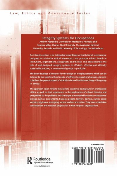 An integrity system is an integrated assemblage of institutional mechanisms, designed to minimize ethical misconduct and promote ethical health in institutions, organizations, occupations and the like. This book analyses, describes and demonstrates the value of well-designed integrity systems for efficient, effective and ethically sustainable practice, in occupational groups in particular. Developing a blueprint for the design of integrity systems which can be tailored to the specific ethical needs of different occupational groups, this book furthers the general project of ethically informed institutional design ('designing-in' ethics). The approach taken reflects the authors' academic background in professional ethics, as well as their extensive experience in the application of ethical theories and perspectives to the problems and challenges encountered by various occupational groups, such as accountants, business people, lawyers, doctors, nurses, social workers, engineers, emergency service workers and police.