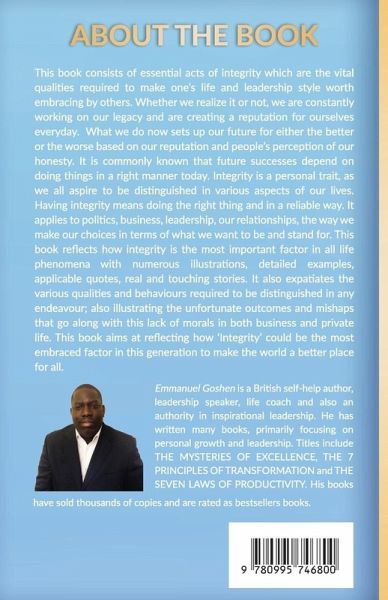 This book consists of essential acts of integrity which are the vital qualities required to make one’s life and leadership style worth embracing by others. Whether we realize it or not, we are constantly working on our legacy and are creating a reputation for ourselves everyday. What we do now sets up our future for either the better or the worse based on our reputation and people’s perception of our honesty. It is commonly known that future successes depend on doing things in a right manner today. Integrity is a personal trait, as we all aspire to be distinguished in various aspects of our lives. Having integrity means doing the right thing and in a reliable way. It applies to politics, business, leadership, our relationships, the way we make our choices in terms of what we want to be and stand for. This book reflects how integrity is the most important factor in all life phenomena with numerous illustrations, detailed examples, applicable quotes, real and touching stories. It also expatiates the various qualities and behaviors required to be distinguished in any endeavor; also illustrating the unfortunate outcomes and mishaps that go along with this lack of morals in both business and private life. This book aims at reflecting how ‘Integrity’ could be the most embraced factor in this generation to make the world a better place for all.