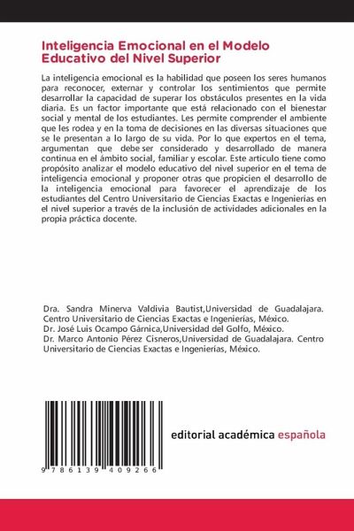 La inteligencia emocional es la habilidad que poseen los seres humanos para reconocer, externar y controlar los sentimientos que permite desarrollar la capacidad de superar los obstáculos presentes en la vida diaria. Es un factor importante que está relacionado con el bienestar social y mental de los estudiantes. Les permite comprender el ambiente que les rodea y en la toma de decisiones en las diversas situaciones que se le presentan a lo largo de su vida. Por lo que expertos en el tema, argumentan que debe ser considerado y desarrollado de manera continua en el ámbito social, familiar y escolar. Este artículo tiene como propósito analizar el modelo educativo del nivel superior en el tema de inteligencia emocional y proponer otras que propicien el desarrollo de la inteligencia emocional para favorecer el aprendizaje de los estudiantes del Centro Universitario de Ciencias Exactas e Ingenierías en el nivel superior a través de la inclusión de actividades adicionales en la propia práctica docente.