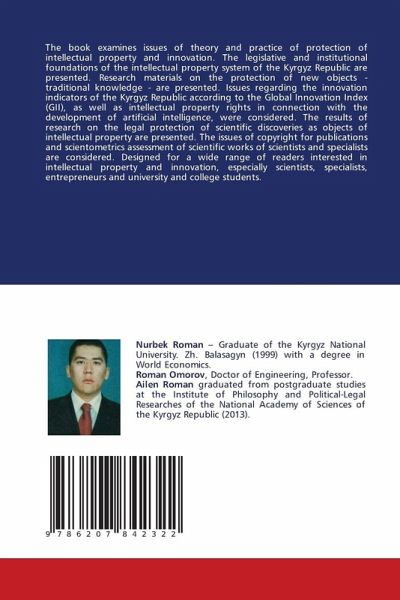 The book examines issues of theory and practice of protection of intellectual property and innovation. The legislative and institutional foundations of the intellectual property system of the Kyrgyz Republic are presented. Research materials on the protection of new objects - traditional knowledge - are presented. Issues regarding the innovation indicators of the Kyrgyz Republic according to the Global Innovation Index (GII), as well as intellectual property rights in connection with the development of artificial intelligence, were considered. The results of research on the legal protection of scientific discoveries as objects of intellectual property are presented. The issues of copyright for publications and scientometrics assessment of scientific works of scientists and specialists are considered. Designed for a wide range of readers interested in intellectual property and innovation, especially scientists, specialists, entrepreneurs and university and college students.