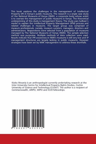 This book explores the challenges in the management of Intellectual Property (IP) in Kenya's public museums. The research is a single case study of the National Museums of Kenya (NMK), a corporate body whose ambit is to oversee the management of public museums in Kenya. The theoretical underpinning of this study is management theory. The study uses Sullivan's model to explain the Intellectual Property Management (IPM) process and related challenges in museums. The target group was comprised of museum professionals, namely, museum curators, managers, directors and administrators. Respondents were selected from a population of museums managed by The National Museums of Kenya (NMK). The sample selection method was purposive. Multiple methods of data collection were used. Results indicate that IPR awareness in NMK's museums is still very low and IP management structures are largely lacking in public museums. However strategies have been set by NMK management to address these shortfalls.
