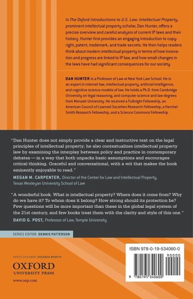 In The Oxford Introductions to U.S. Law: Intellectual Property, prominent intellectual property scholar Daniel Hunter provides a precise, engaging overview and careful analysis of current laws of intellectual property and their history. Hunter first focuses on the central areas of intellectual property law, including copyright, patent, trademark, and trade secrets. He then moves beyond the basics, exploring the politics, economics, psychology and rhetoric of possession and control that influence and interact with this area of law. Hunter explains how intellectual property has contributed greatly to the innovations that we, as a society, need in our modern lives. He also describes ways in which the expansion of intellectual property can reduce innovation by stopping others from implementing great ideas or producing new work. Hunter helps readers think about modern intellectual property in a way that allows them to see how innovation and progress are linked to intellectual property law, and how small changes in the laws have had significant consequences for our society. Ultimately, Hunter helps readers form their own views about the various areas within the arena of intellectual property.