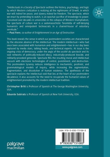 This book reveals the sense in which our postmodern societies are characterized by the obscene absence of the intellectual. The modern intellectual--who had once been associated with humanism and enlightenment-has in our day been replaced by media stars, talking heads, and technical experts. At issue is the ongoing crisis of democracy, under the aegis of the société du spectacle and its vast networks of politically-induced idiocy, industrially-produced biocide, and militarily-provoked genocide. Spectacle fills the resulting moral and intellectual vacuum with electronic technologies of control, punishment, and destruction. This postmodern tyranny reduces intelligence to mechanistic, positivist, and grammatological models of inquiry, while increasing the segmentation, fragmentation, and dissolution of human existence. The apotheosis of the spectacle explains the intellectual void that lies at the heart of our postmodern decadence; it also accounts for theneed to recuperate the humanist values of enlightenment promoted by the modern intellectual tradition.