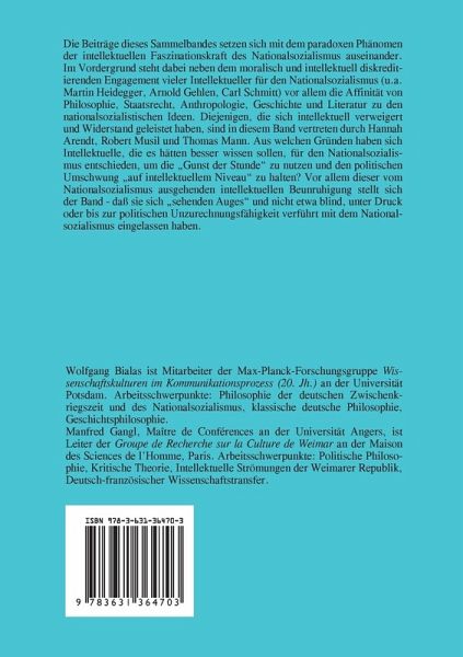 Die Beiträge dieses Sammelbandes setzen sich mit dem paradoxen Phänomen der intellektuellen Faszinationskraft des Nationalsozialismus auseinander. Im Vordergrund steht dabei neben dem moralisch und intellektuell diskreditierenden Engagement vieler Intellektueller für den Nationalsozialismus (u.a. Martin Heidegger, Arnold Gehlen, Carl Schmitt) vor allem die Affinität von Philosophie, Staatsrecht, Anthropologie, Geschichte und Literatur zu den nationalsozialistischen Ideen. Diejenigen, die sich intellektuell verweigert und Widerstand geleistet haben, sind in diesem Band vertreten durch Hannah Arendt, Robert Musil und Thomas Mann. Aus welchen Gründen haben sich Intellektuelle, die es hätten besser wissen sollen, für den Nationalsozialismus entschieden, um die "Gunst der Stunde" zu nutzen und den politischen Umschwung "auf intellektuellem Niveau" zu halten? Vor allem dieser vom Nationalsozialismus ausgehenden intellektuellen Beunruhigung stellt sich der Band - daß sie sich "sehenden Auges" und nicht etwa blind, unter Druck oder bis zur politischen Unzurechnungsfähigkeit verführt mit dem Nationalsozialismus eingelassen haben.