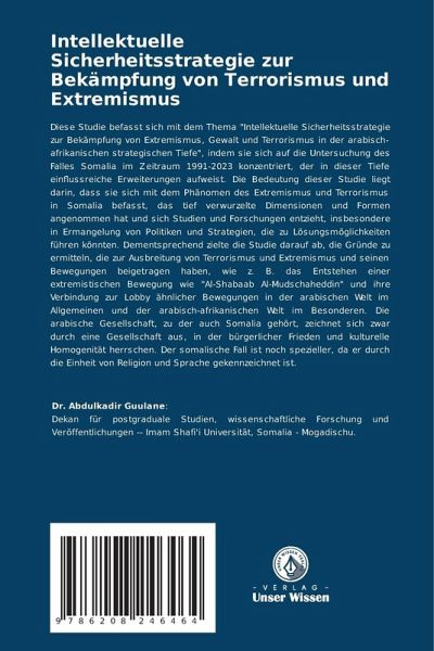 Diese Studie befasst sich mit dem Thema "Intellektuelle Sicherheitsstrategie zur Bekämpfung von Extremismus, Gewalt und Terrorismus in der arabisch-afrikanischen strategischen Tiefe", indem sie sich auf die Untersuchung des Falles Somalia im Zeitraum 1991-2023 konzentriert, der in dieser Tiefe einflussreiche Erweiterungen aufweist. Die Bedeutung dieser Studie liegt darin, dass sie sich mit dem Phänomen des Extremismus und Terrorismus in Somalia befasst, das tief verwurzelte Dimensionen und Formen angenommen hat und sich Studien und Forschungen entzieht, insbesondere in Ermangelung von Politiken und Strategien, die zu Lösungsmöglichkeiten führen könnten. Dementsprechend zielte die Studie darauf ab, die Gründe zu ermitteln, die zur Ausbreitung von Terrorismus und Extremismus und seinen Bewegungen beigetragen haben, wie z. B. das Entstehen einer extremistischen Bewegung wie "Al-Shabaab Al-Mudschaheddin" und ihre Verbindung zur Lobby ähnlicher Bewegungen in der arabischen Welt im Allgemeinen und der arabisch-afrikanischen Welt im Besonderen. Die arabische Gesellschaft, zu der auch Somalia gehört, zeichnet sich zwar durch eine Gesellschaft aus, in der bürgerlicher Frieden und kulturelle Homogenität herrschen. Der somalische Fall ist noch spezieller, da er durch die Einheit von Religion und Sprache gekennzeichnet ist.